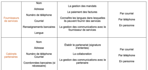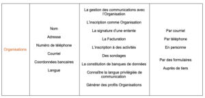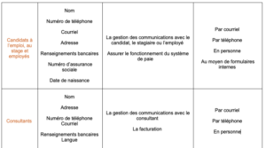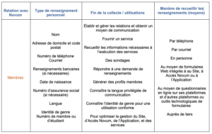 Veuillez noter que la plupart des Renseignements personnels gérés Novum sont des Renseignements personnels d’employés, de candidats pour un emploi, de consultants et de membres. Pour ce qui est des autres catégories de personnes indiquées dans le tableau ci-dessous, les renseignements fournis sont, dans la majorité des cas, des renseignements de nature professionnelle ou d’affaires (voir la section 2 sur les coordonnées professionnelles). À noter que dans la majorité des cas, Novum recueille également le titre/fonction professionnel(le) des personnes, le nom de l’Organisation et/ou l’adresse de l’organisation (voir la section 2 sur les coordonnées professionnelles).
